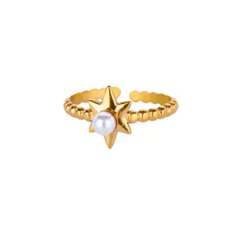 Stainless Steel 18K Gold-Plated Star & Pearl Open Ring for Women